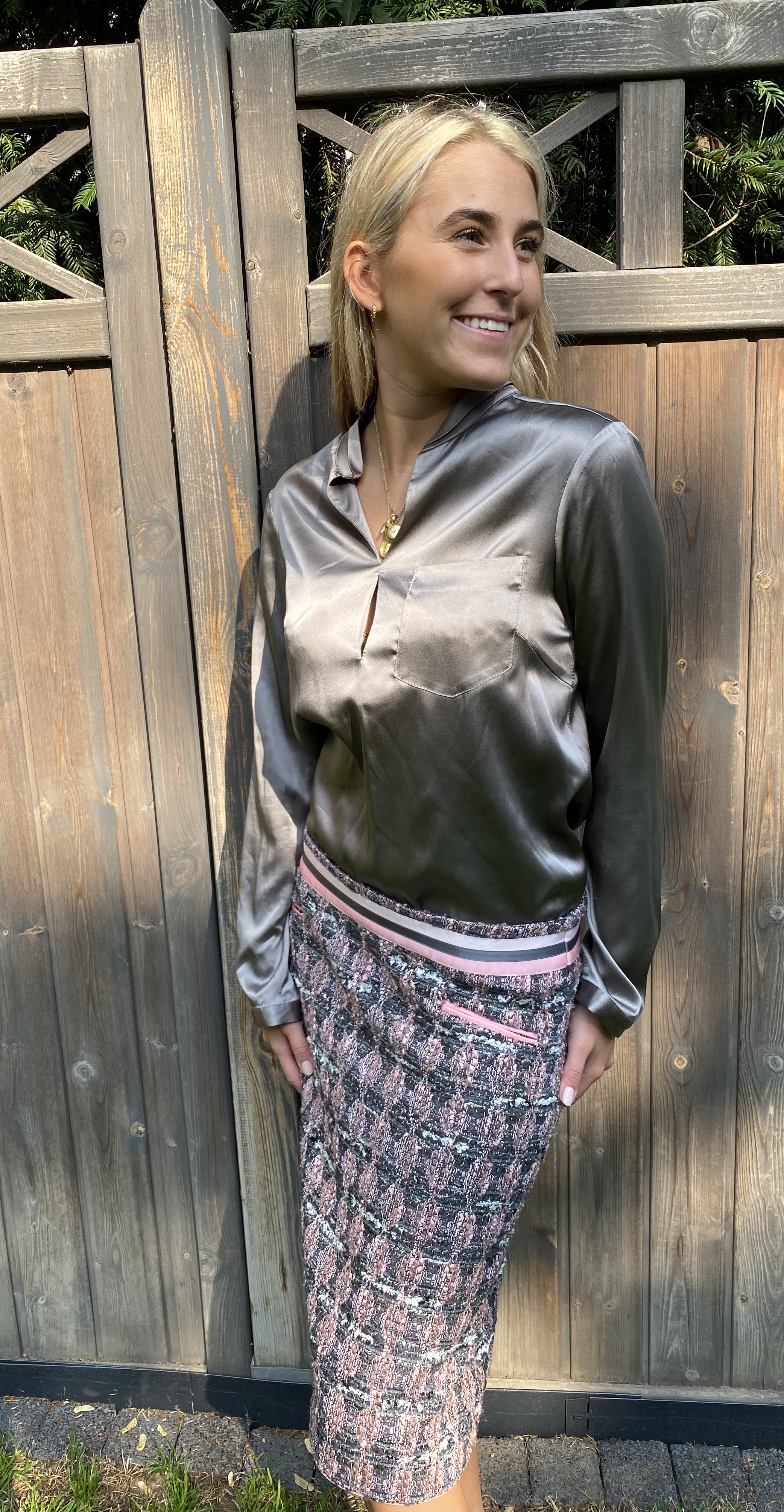 -rosa-grauer Bouclerock in A-Linie mit grauem Ripsband gepaspelt